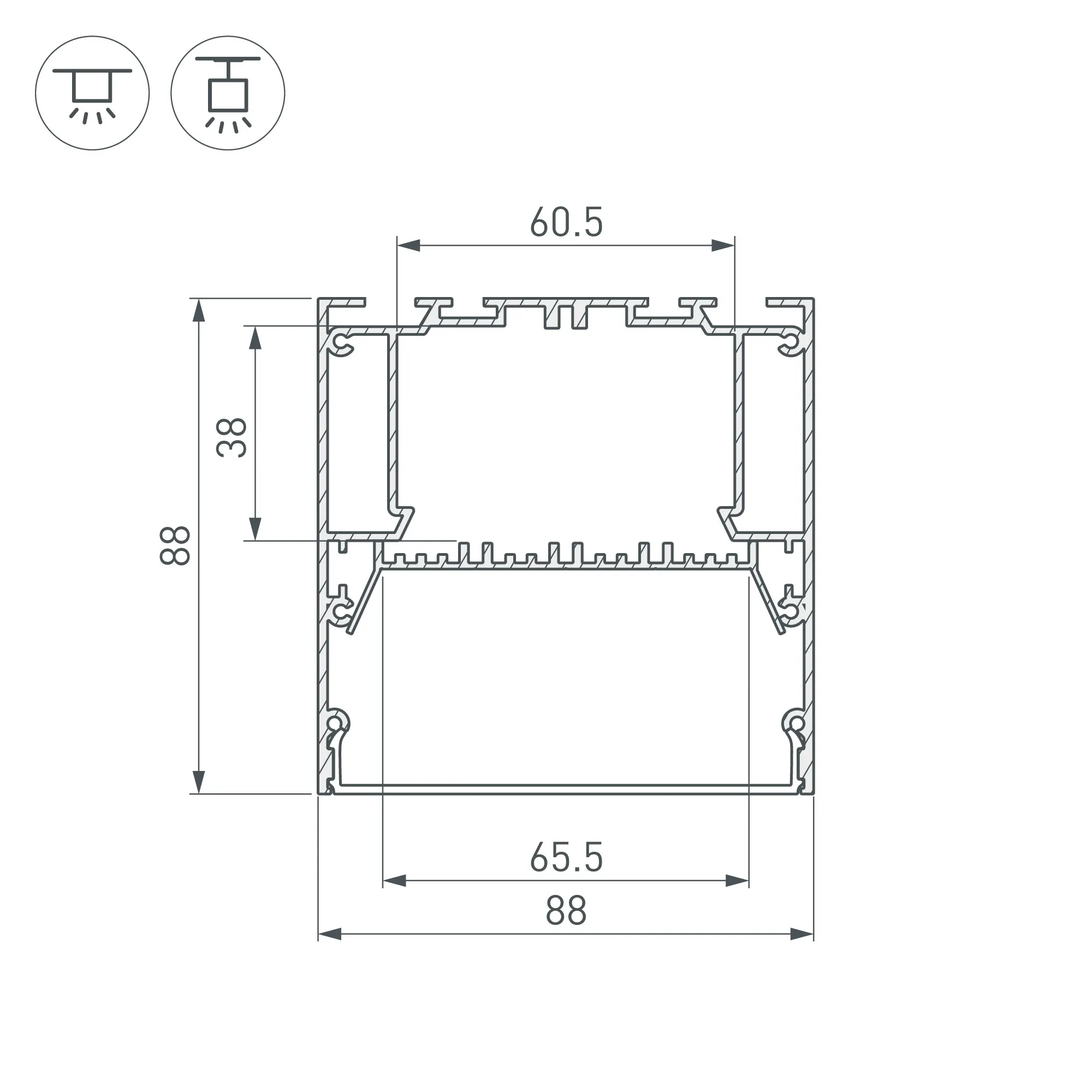 Под заказ от 24 м. Алюминиевый анодированный профиль для светодиодных лент и линеек. Габаритные размеры (L×W×H): 2000x88x88 мм. Ширина площадки для ленты 65,5 мм. Состоит из профиля и основания для ленты. Для их соединения необходим Фиксатор основания арт. 036431 (приобретается отдельно, 4 шт. на 2 м. профиля). Отсек для БП 48х38 мм. Экраны, заглушки и другие аксессуары приобретаются отдельно. Цена за 1 метр.