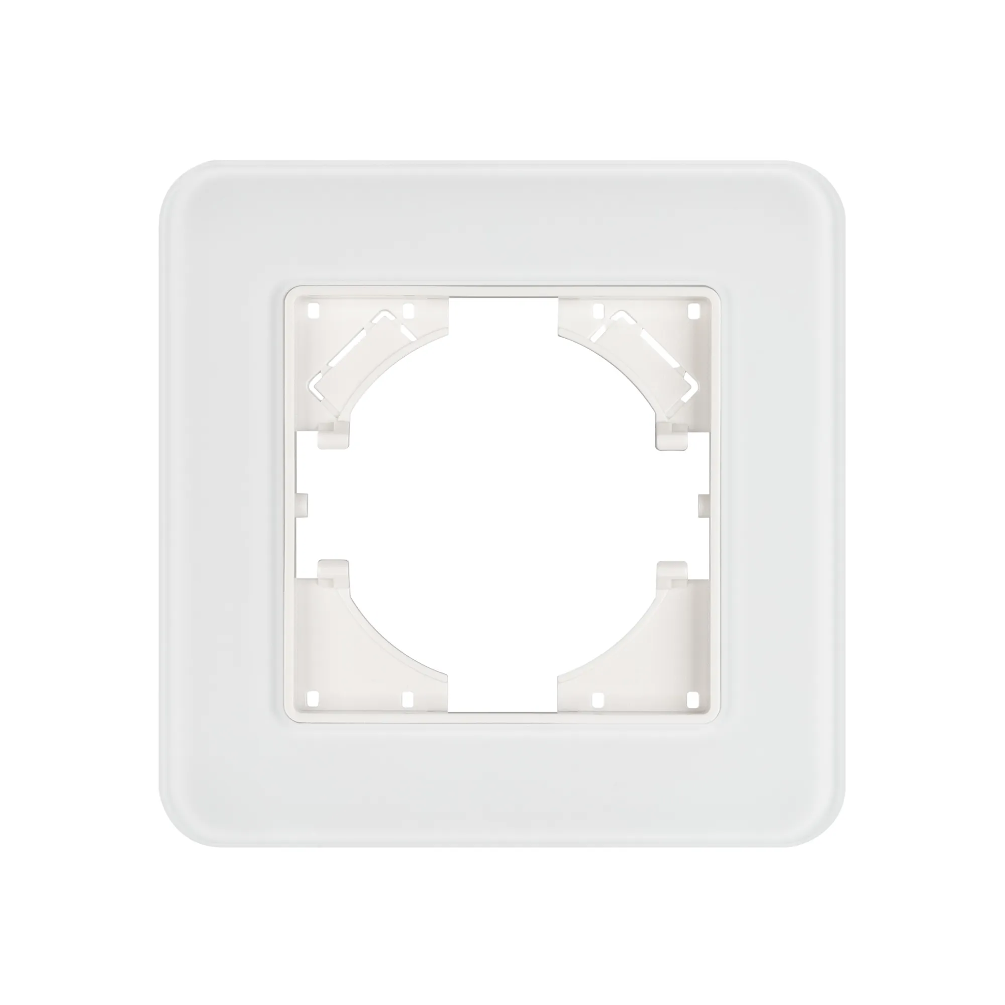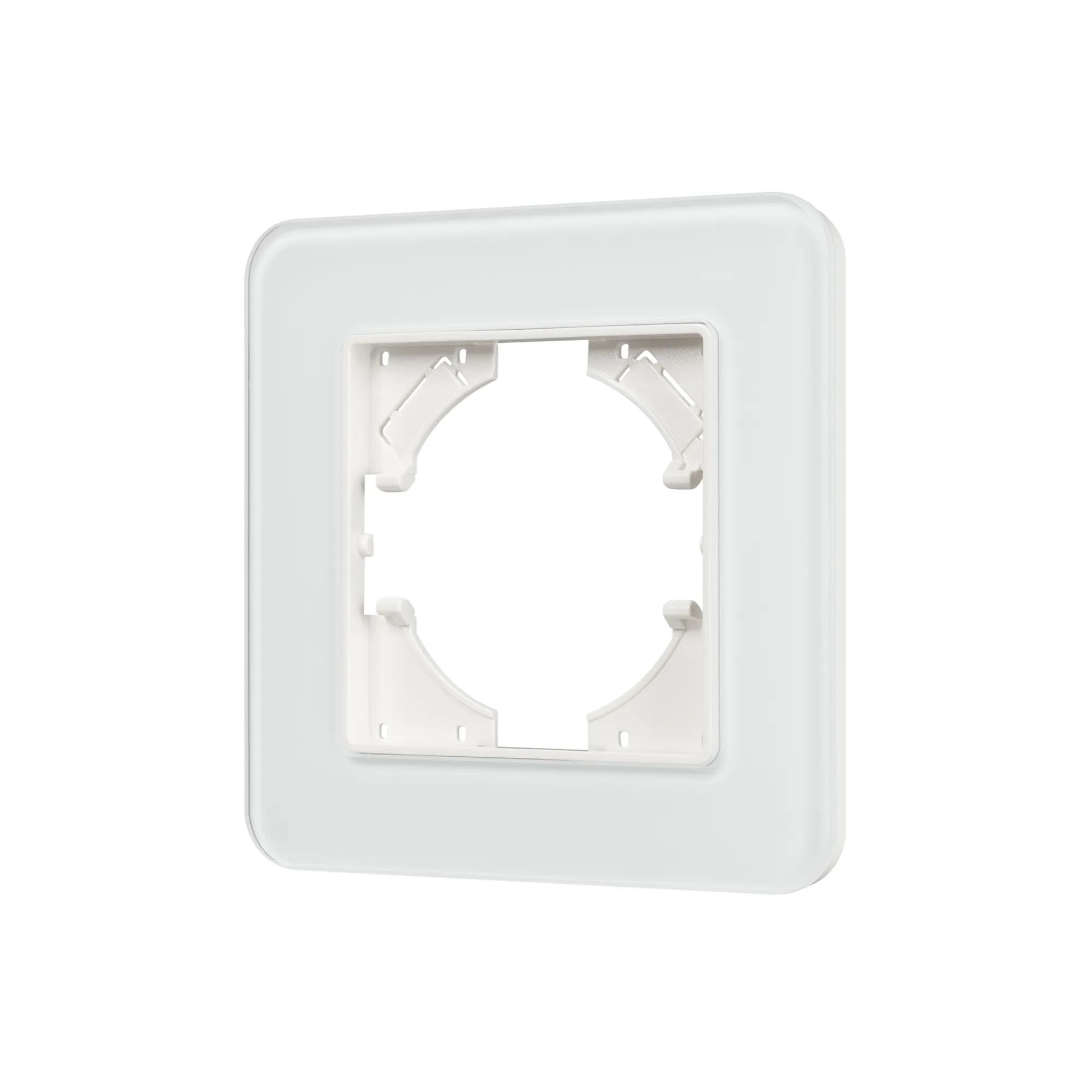 Рамка стеклянная на 1 пост, под встраиваемый механизм. Цвет - белый с Soft-Touch покрытием. Уровень герметичности IP20. Ориентация монтажа - горизонтальная (основным ориентиром служат посадочные выступы для накладки механизма).