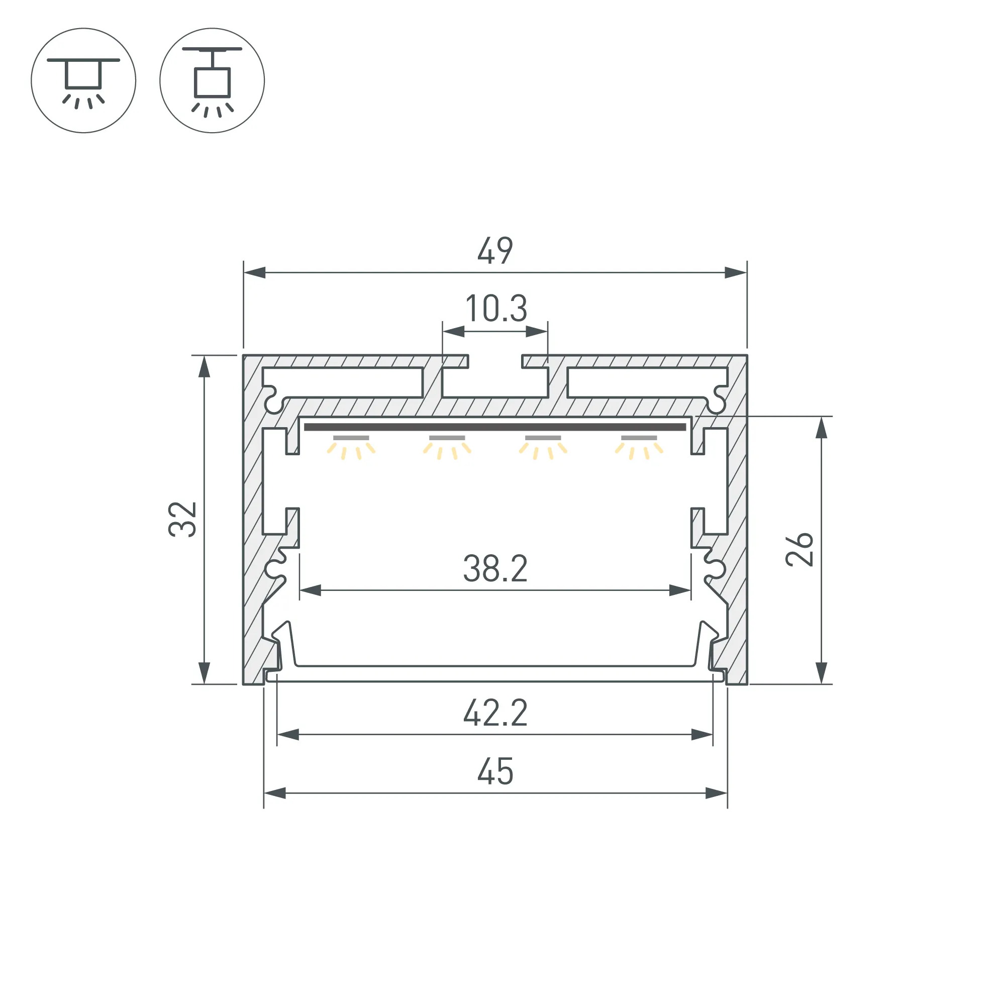 Алюминиевый профиль для светодиодных лент и линеек. Цвет - черный RAL9005 (порошковая окраска).Габаритные размеры (L×W×H): 2000x49x32 мм. Ширина площадки для ленты 38,2 мм. Экраны, заглушки и другие аксессуары приобретаются отдельно. Цена за 1 метр.